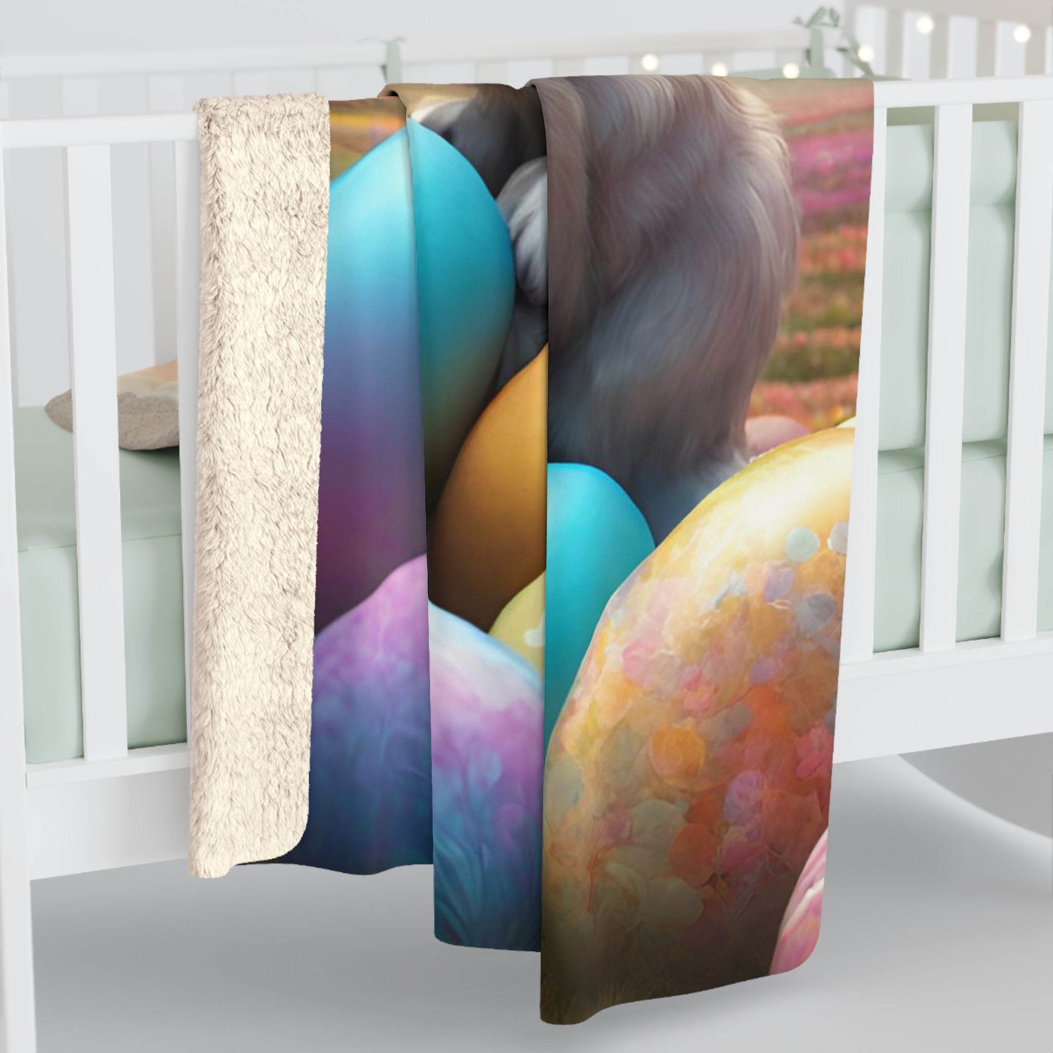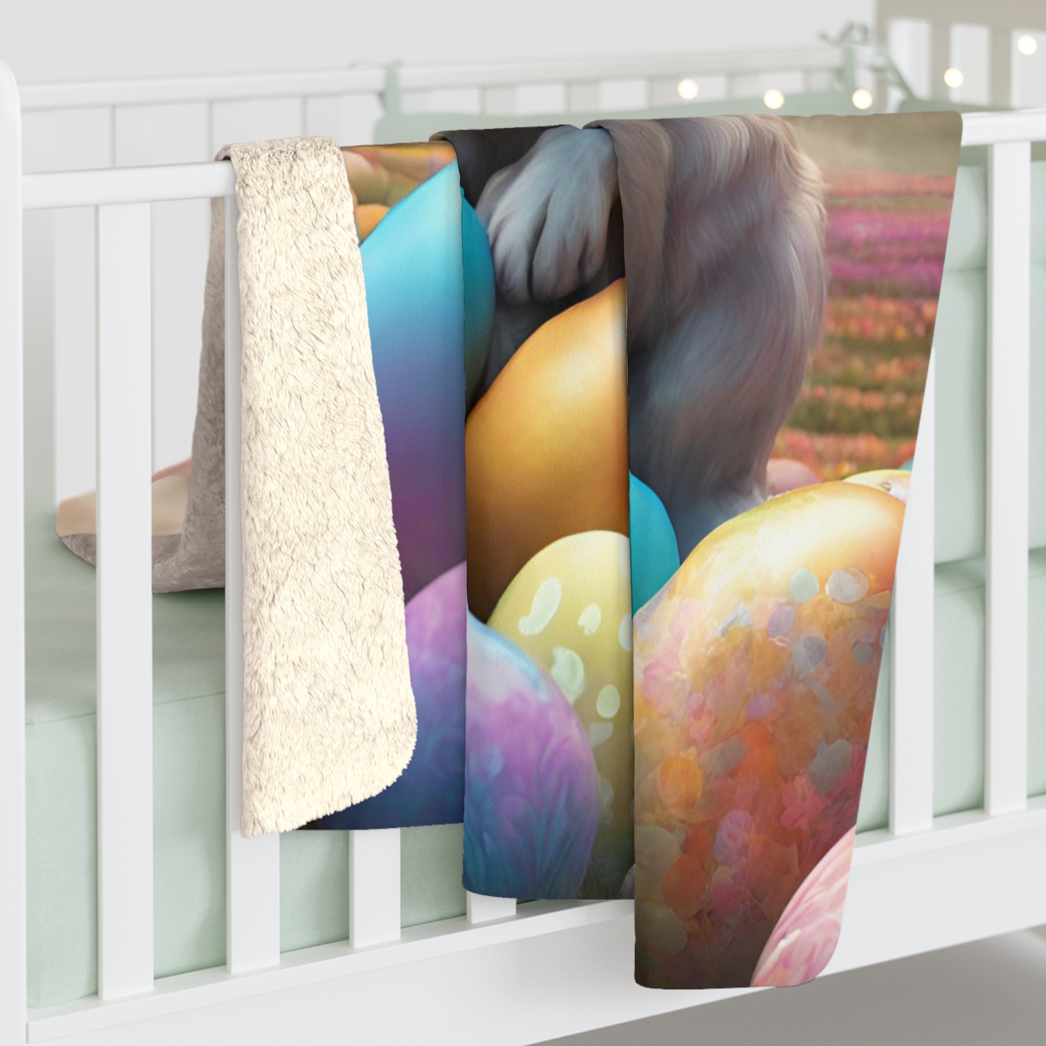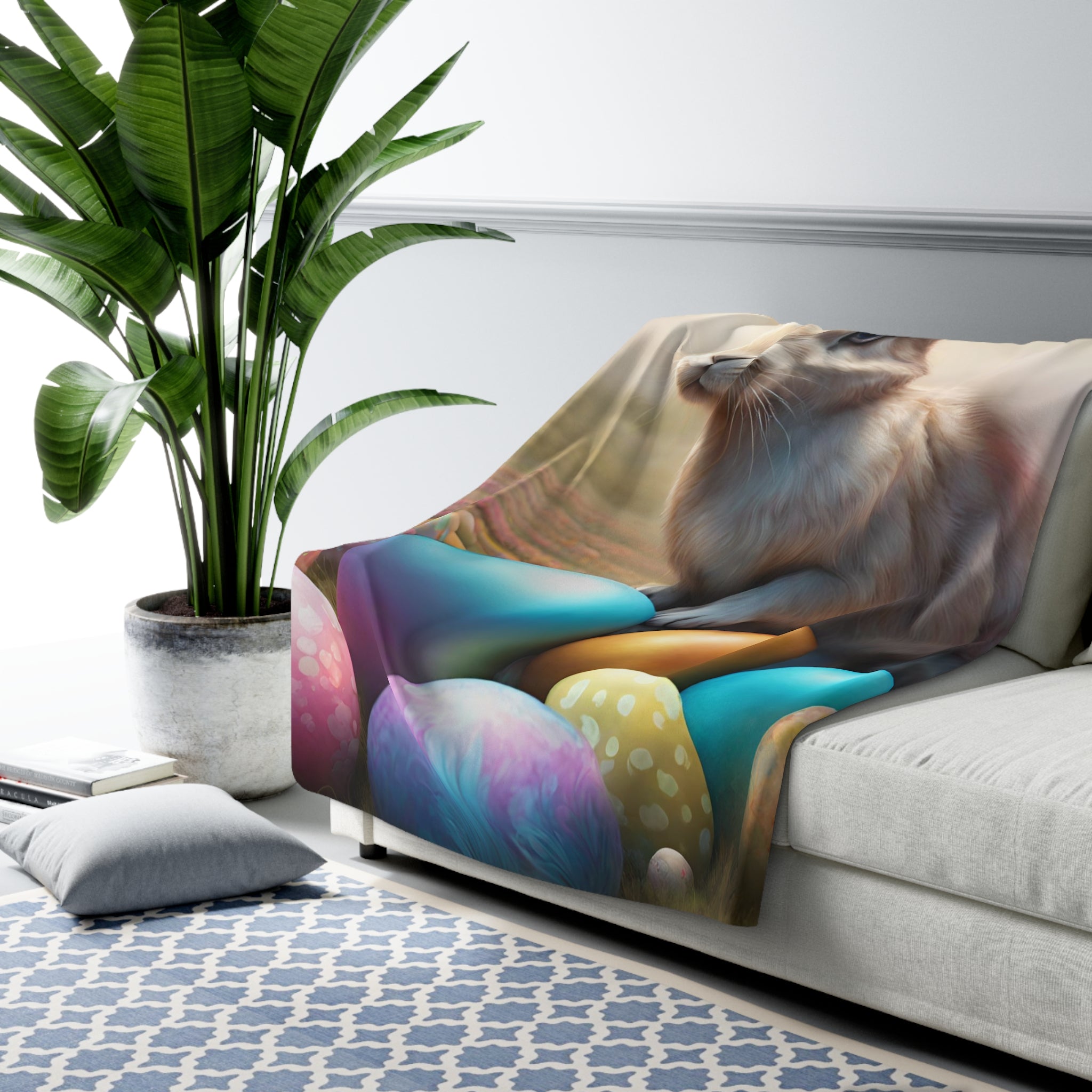 Easter Gift, Bunny Blanket, Fantasy Art, Rabbit Cover, Colored Egg Fleece, Flower Field, Warm Throw, Peter Cottontail, Warm Cozy Sherpa