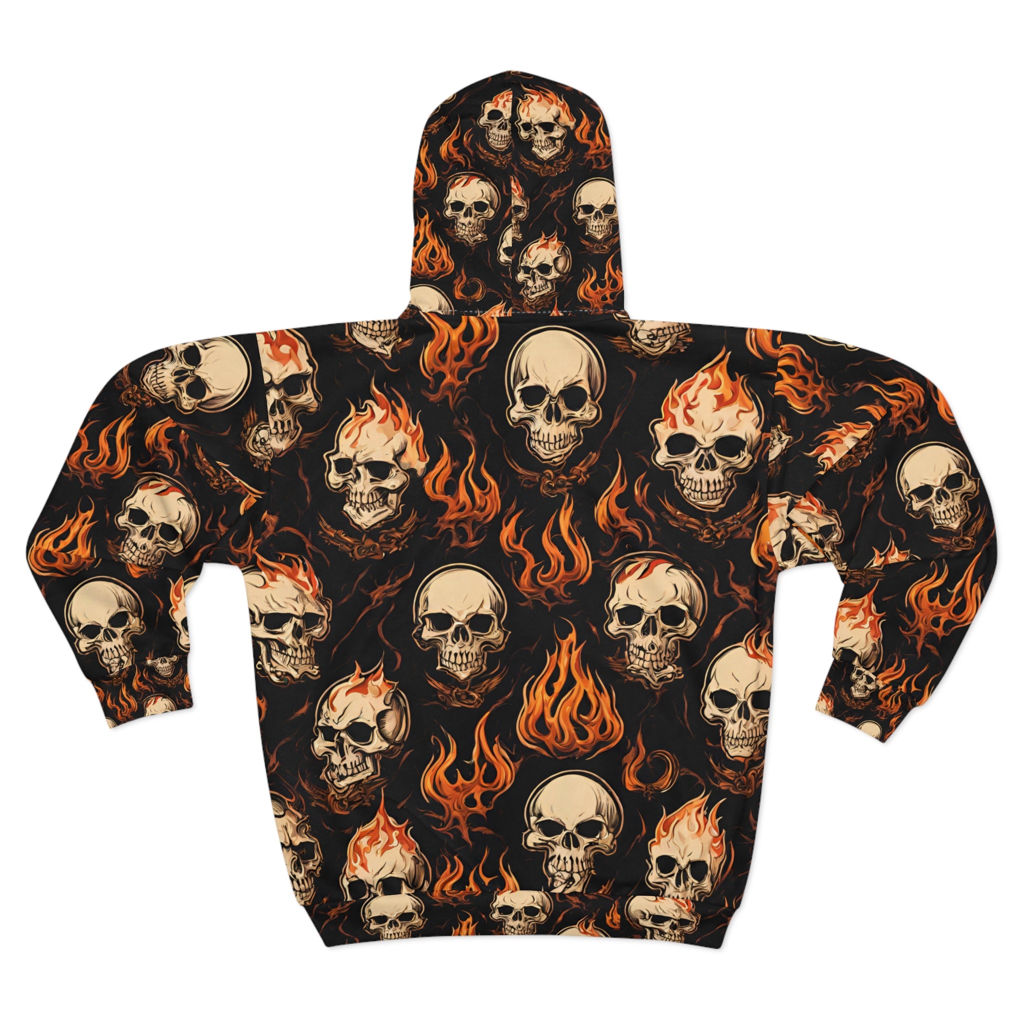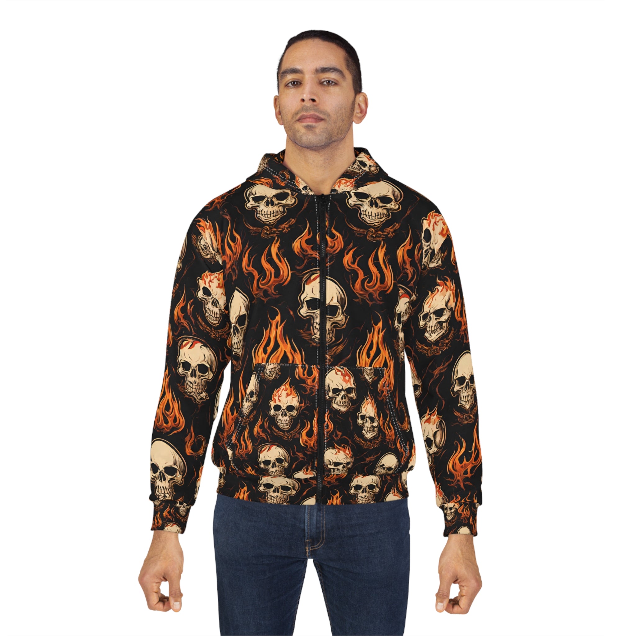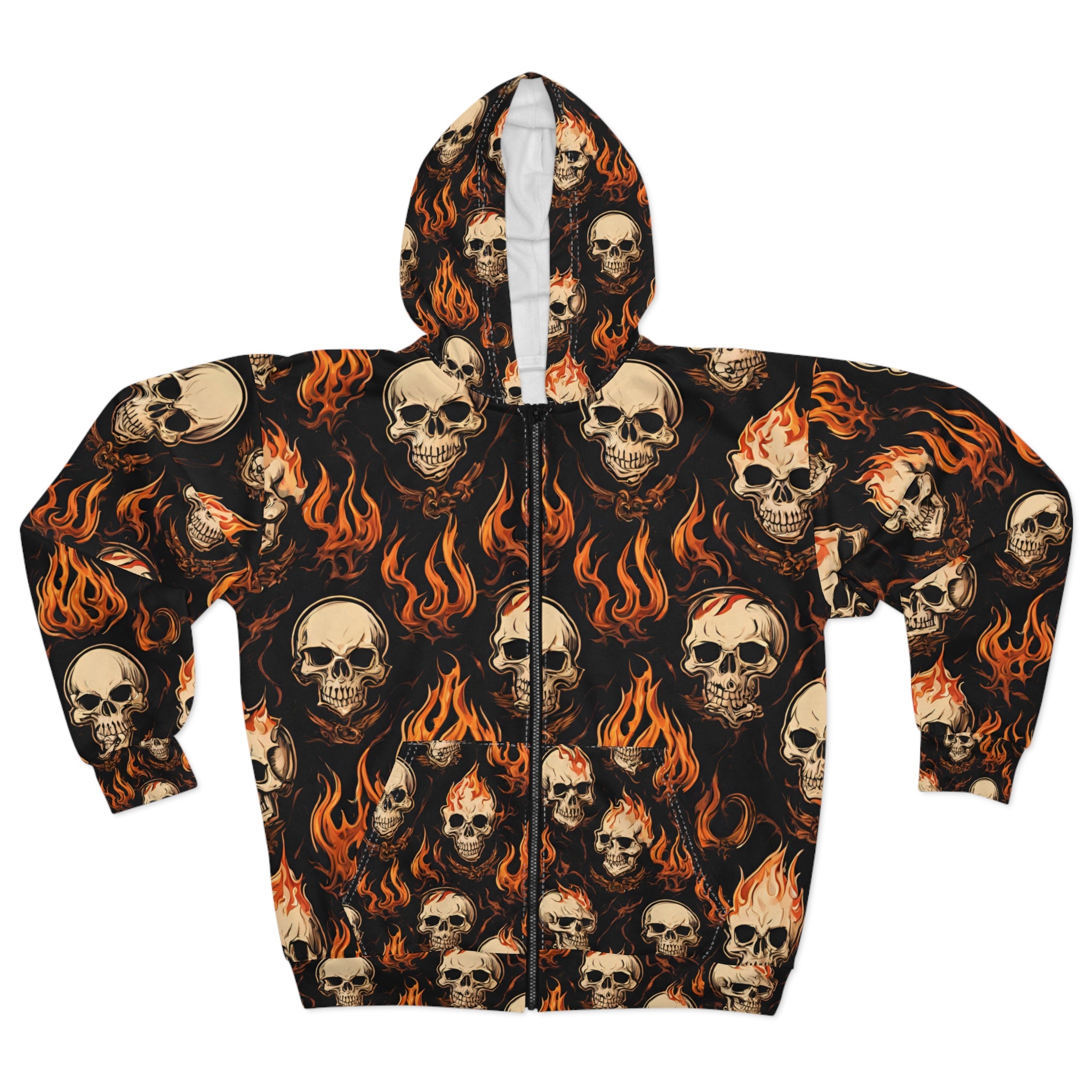 Fire Flames and Skulls Mens or Womens Jacket Hoodie, Hellish Skeletons Biker or Motorcyclist Winter Fleece (AOP)