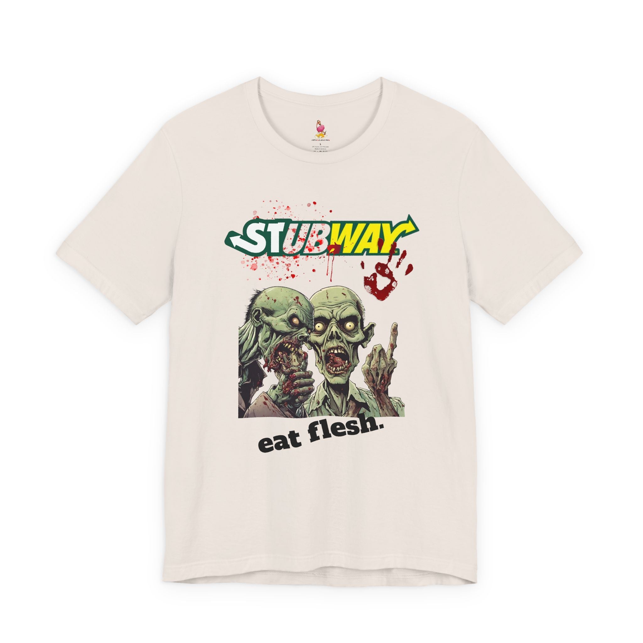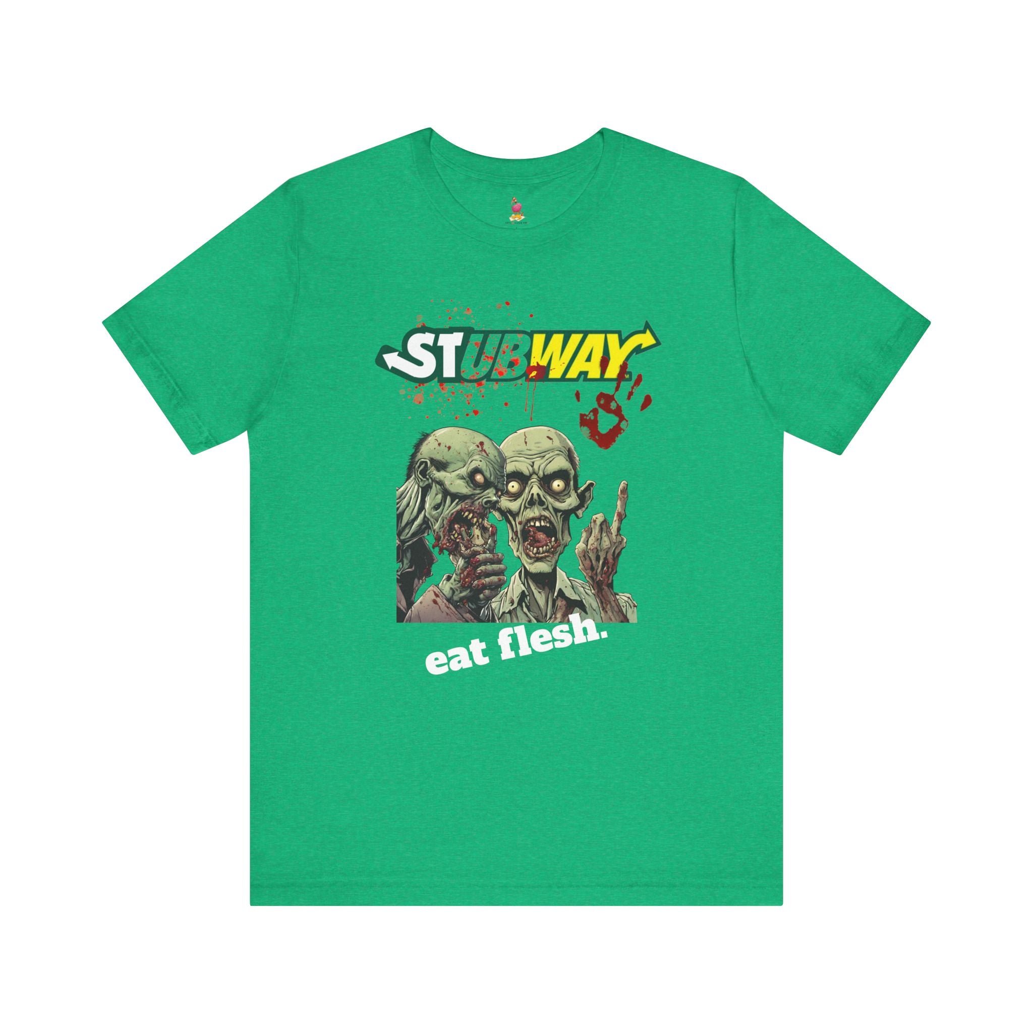 Satisfy your hunger for horror with this hilarious "Stubway Eat Flesh" zombie t-shirt! An awesome spoof on the classic Subway "Eat Fresh" tagline, this tee reimagines the sandwich chain for the zombie apocalypse. Perfect for zombie fans, horror enthusiasts, and anyone who appreciates dark humor and clever parodies.