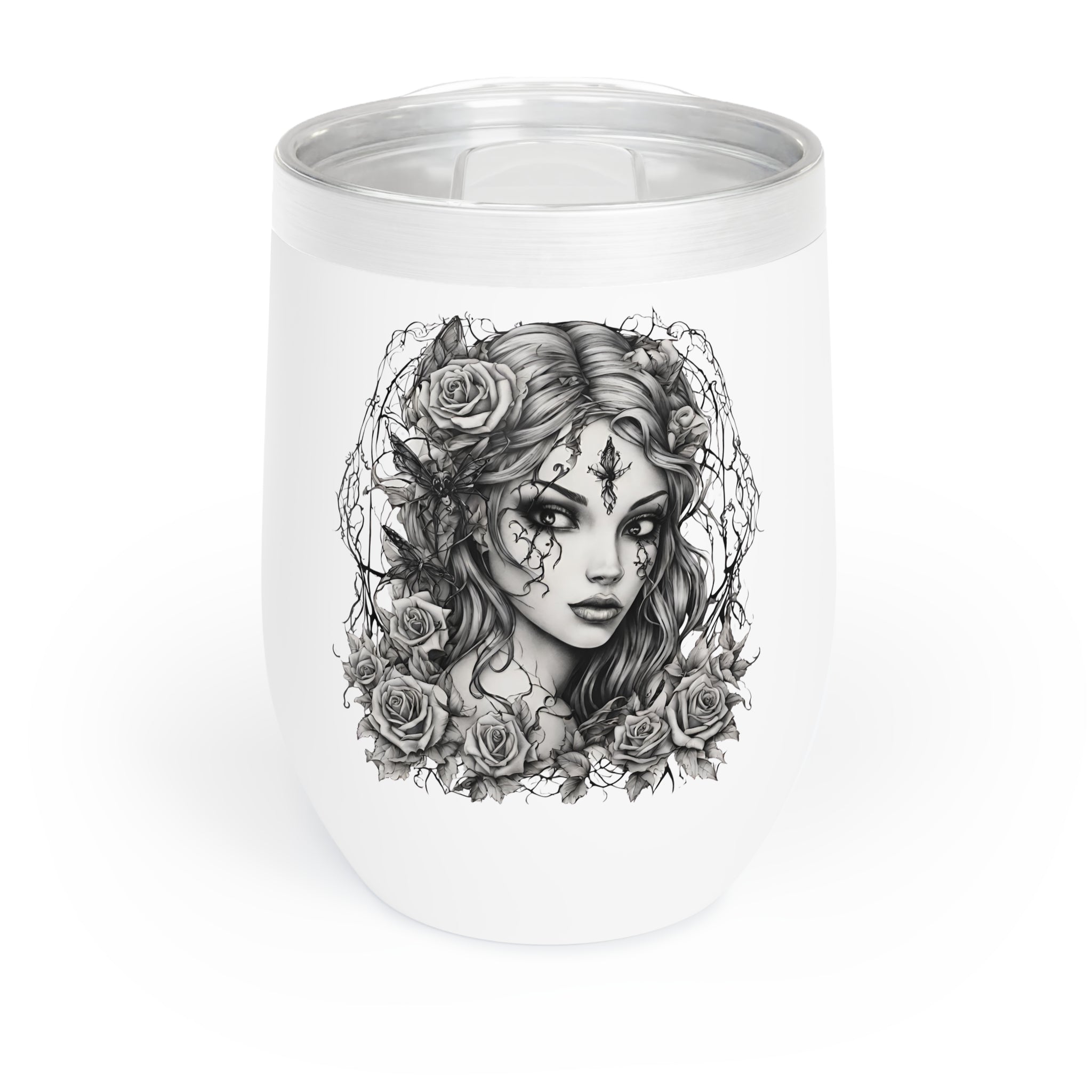The stemless design is as elegant as the fairy herself, and the clear, BPA-free press-on lid with slide closure means you can take your gothic rose fairy wine anywhere—from enchanted gardens to dark forests to your living room.