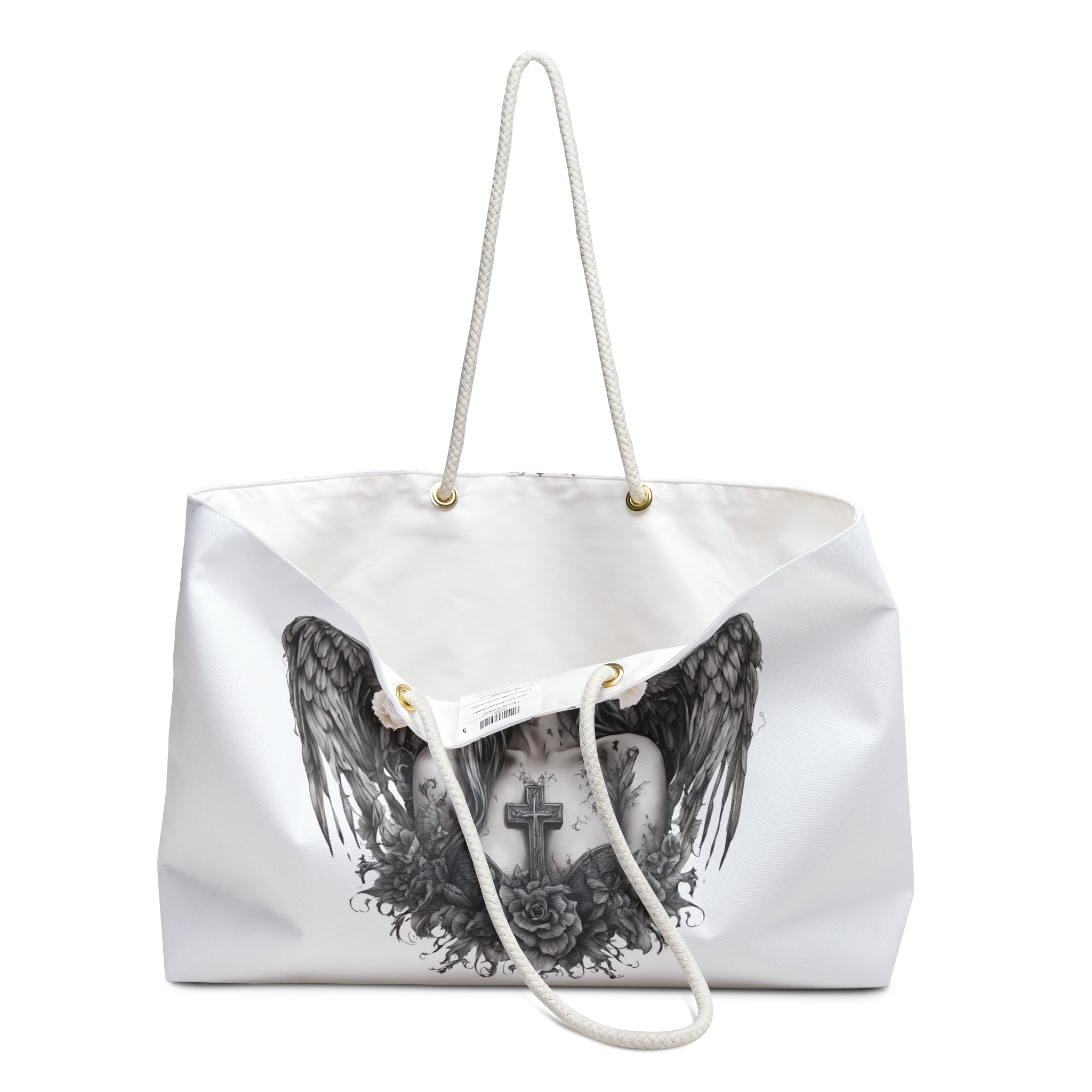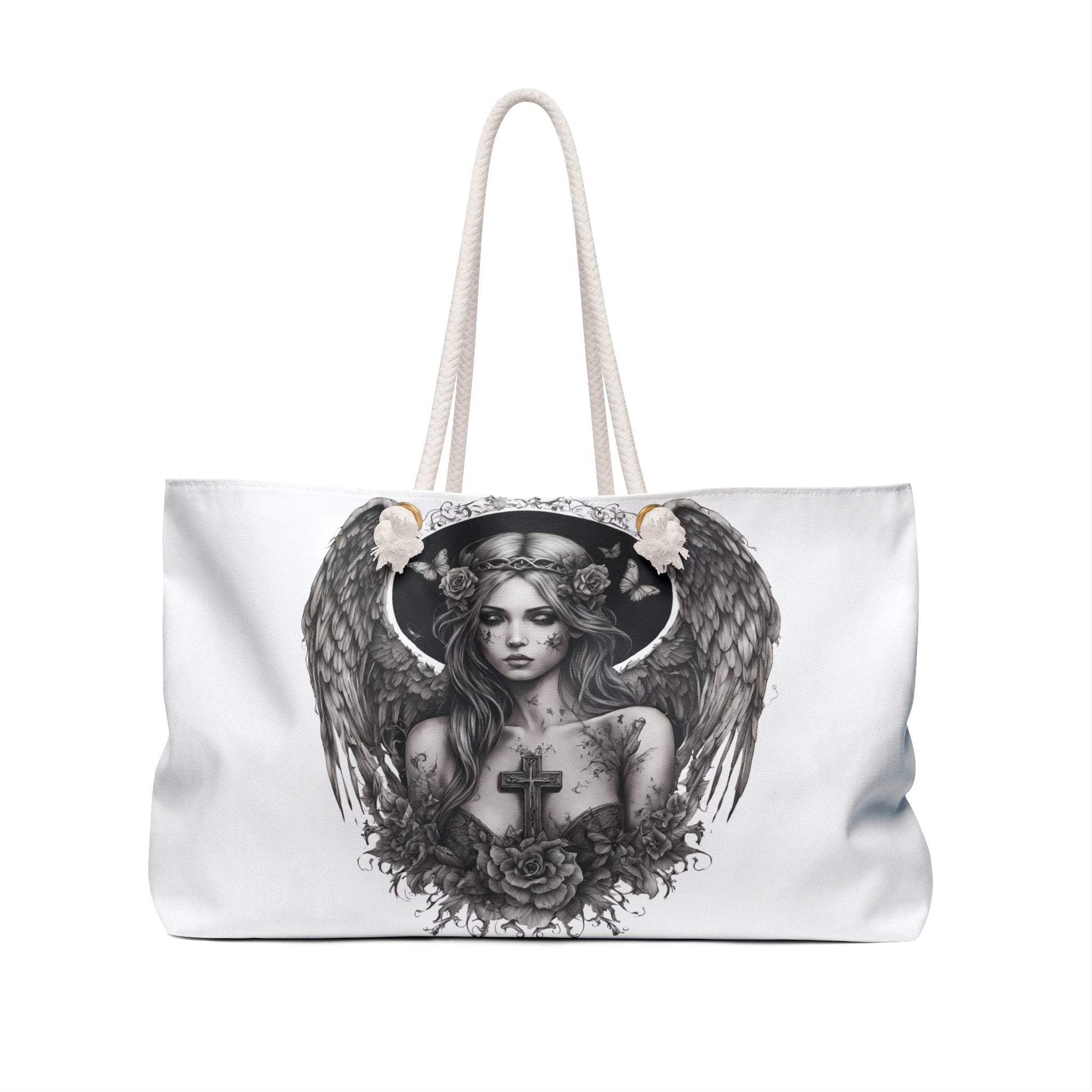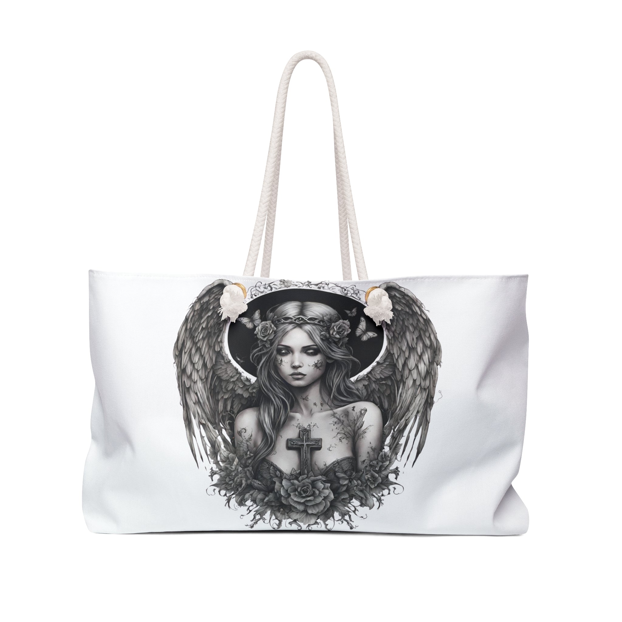 Holy Cross Broken Butterfly Angel Travel Gift Bag, Angelic Fragility Weekend Bag, Mystical Flowered Saint Beauty Tote