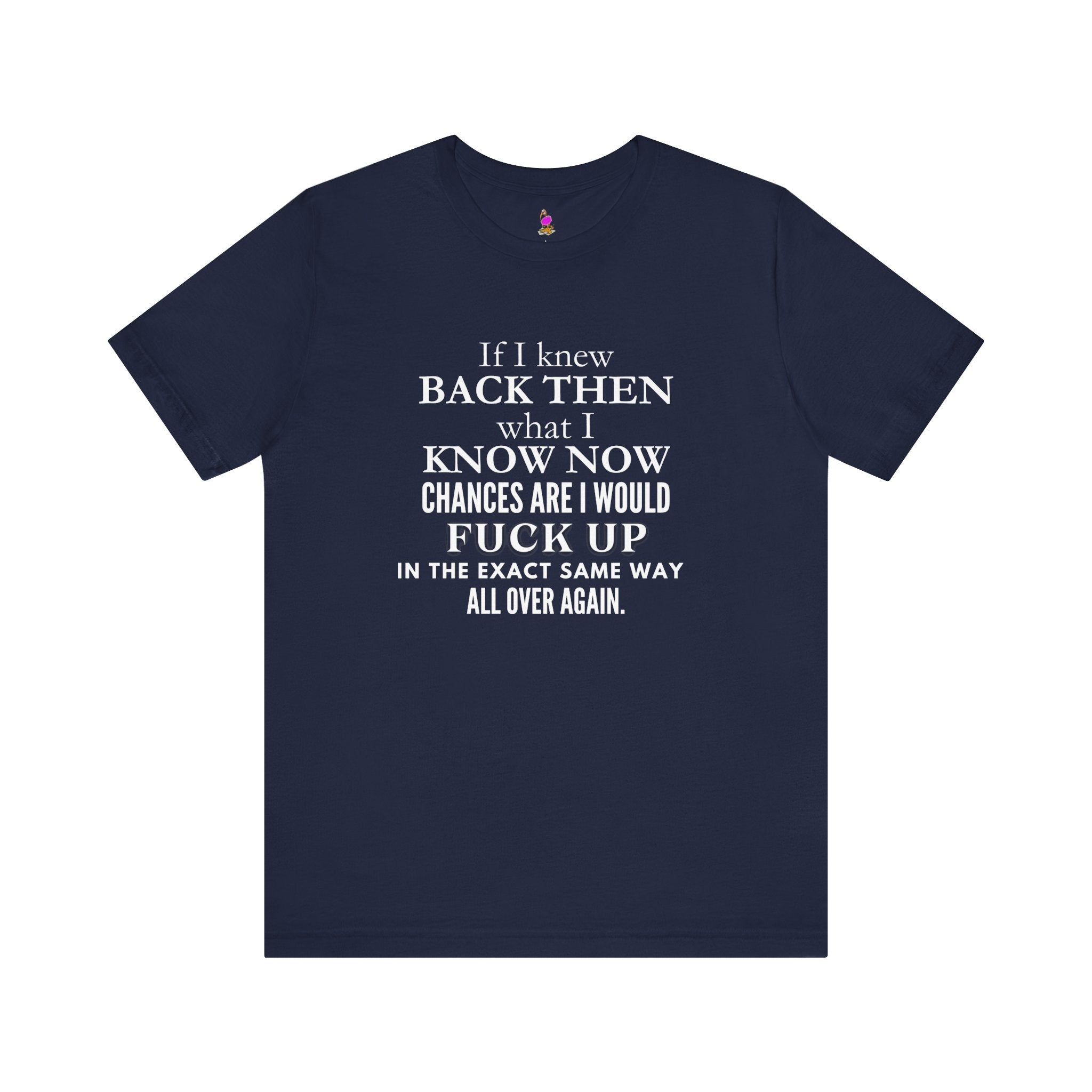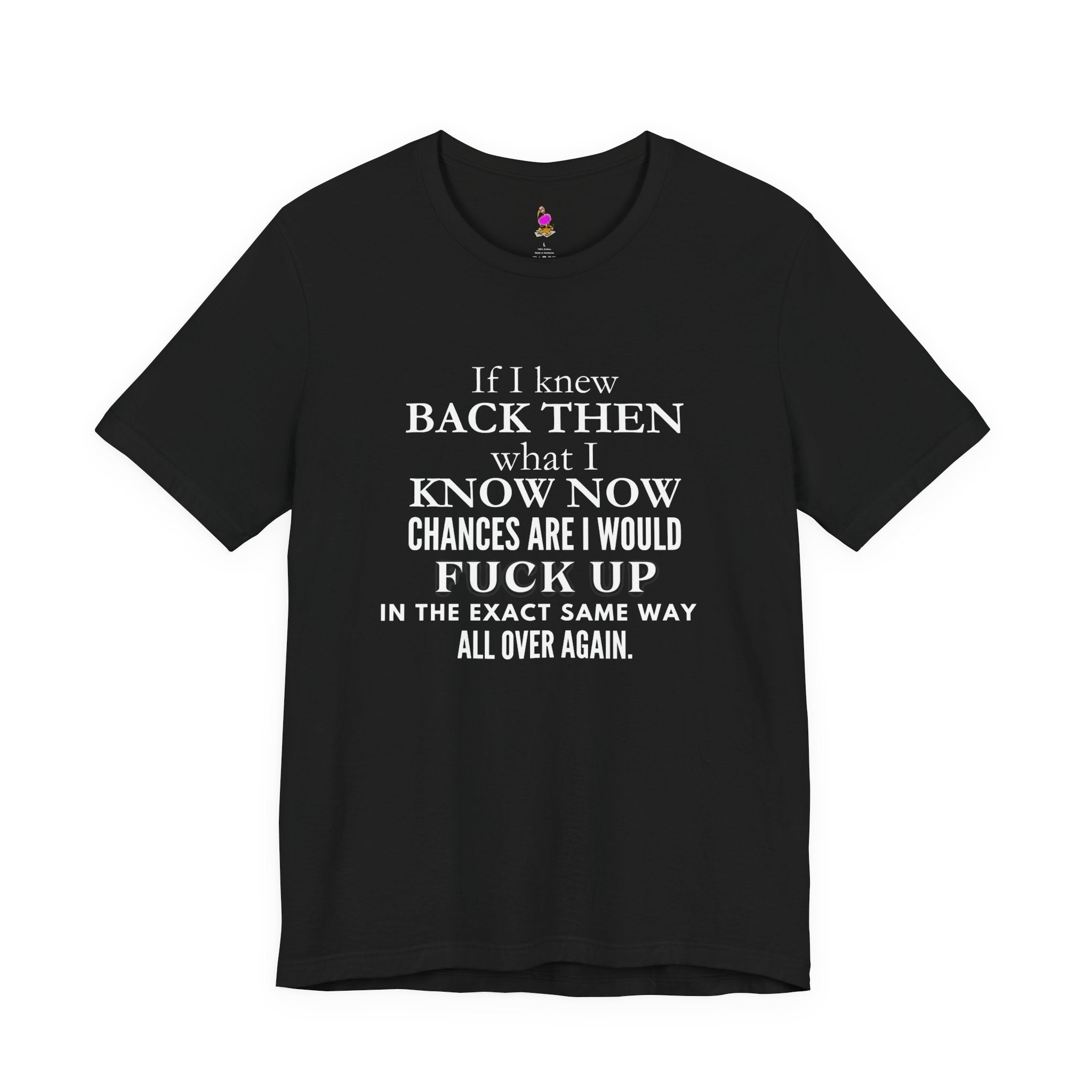 Whether you're someone who's gained wisdom but continued to repeat the same chaos even through experience, this humorous message about life's journey can relate to the feeling of even knowing then what you know now, mistakes are repeatable so why not admit it?! Wearing something that's edgy, relatable, and speaks to the human experience! Great for casual wear, reunions, milestone birthdays, or as a meaningful gift for someone reflecting on their life journey.