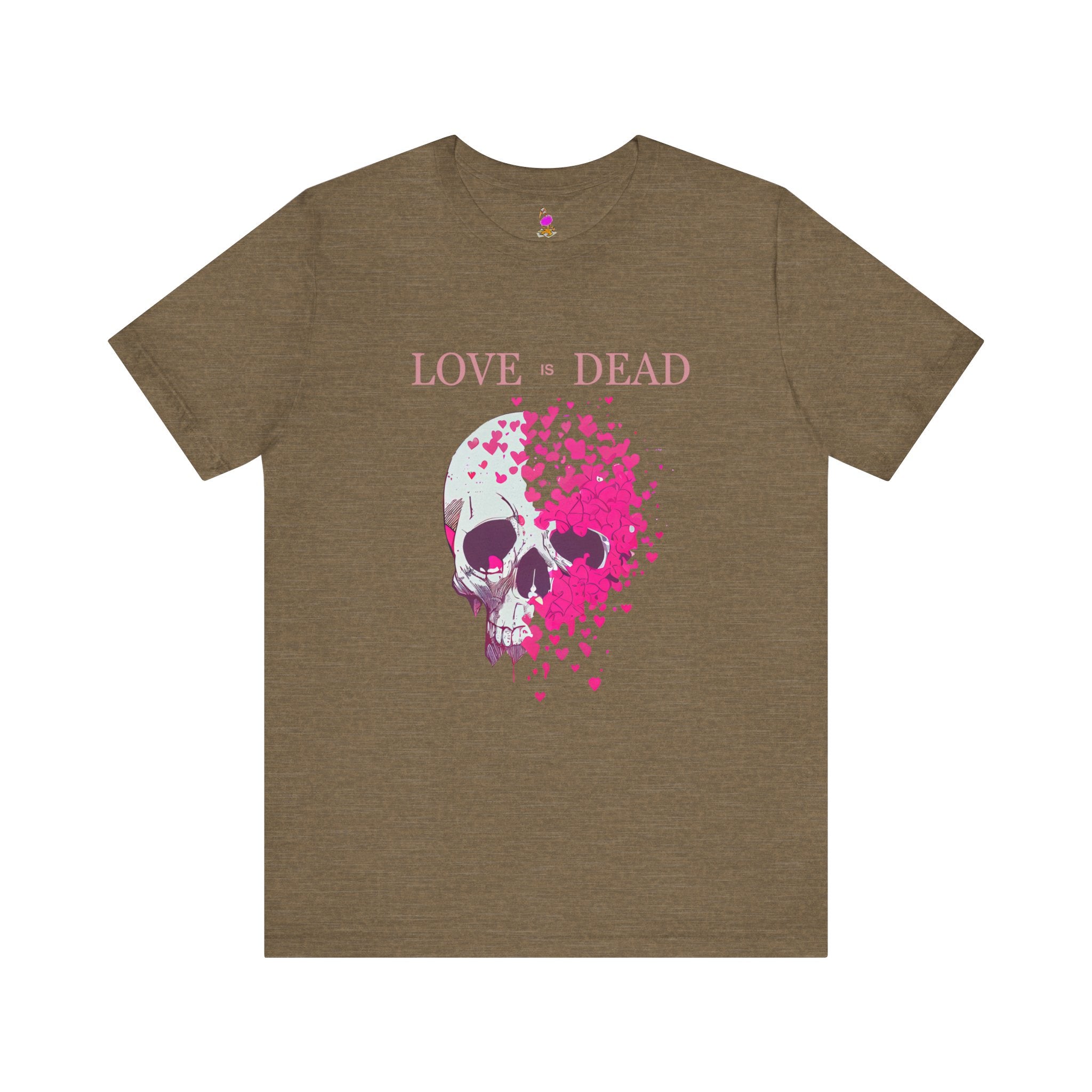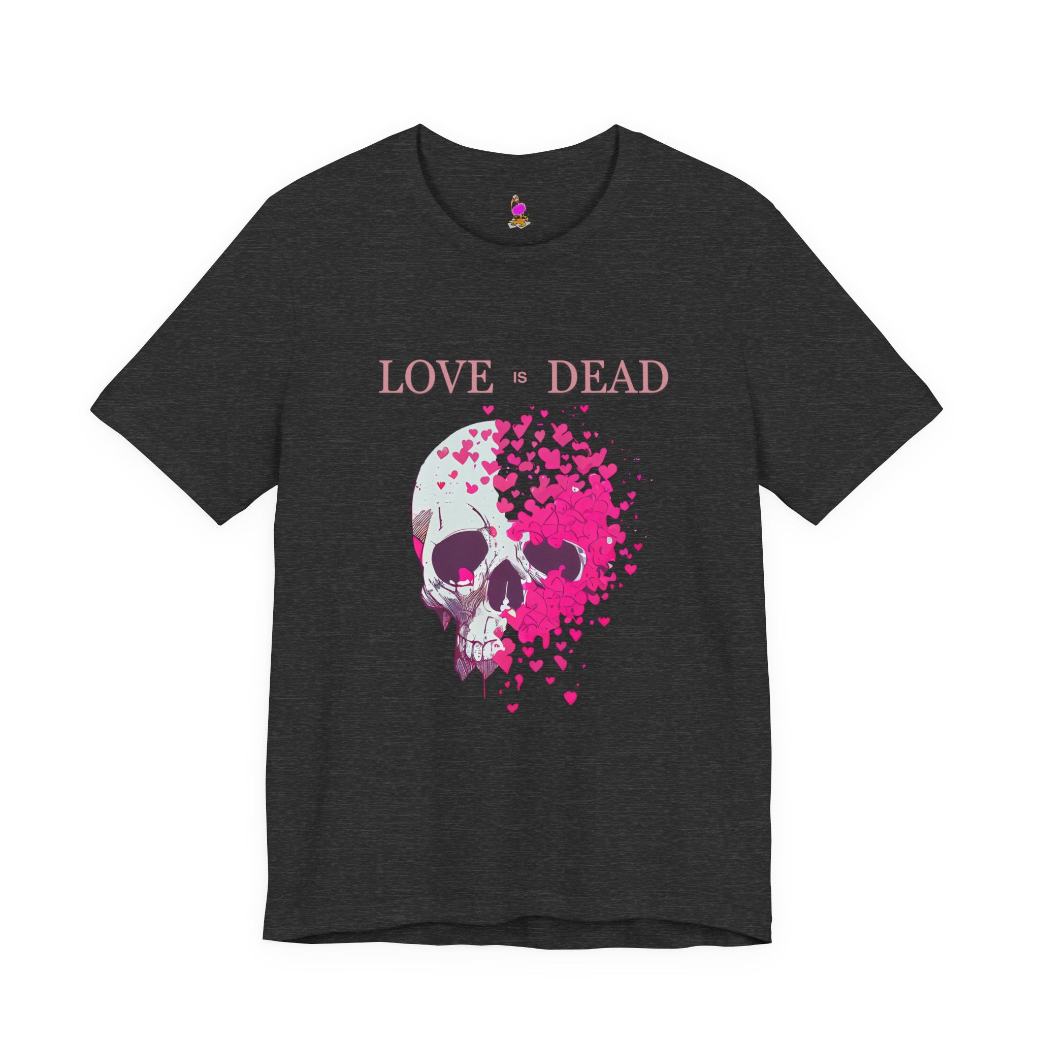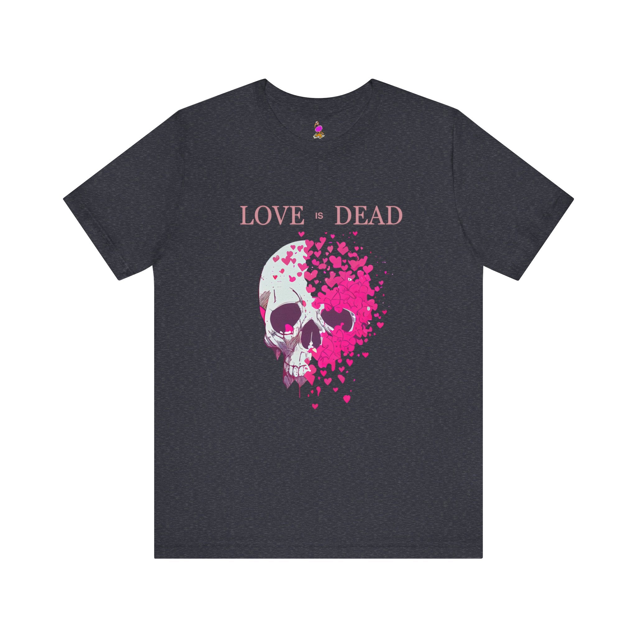 Declare that Love Is Dead with this darkly romantic skull and hearts t-shirt! For hopeless romantics who've been burned, gothic souls who embrace the darker side of love, and anyone who's decided that love is overrated, this tee combines skulls and hearts in a beautifully tragic design.