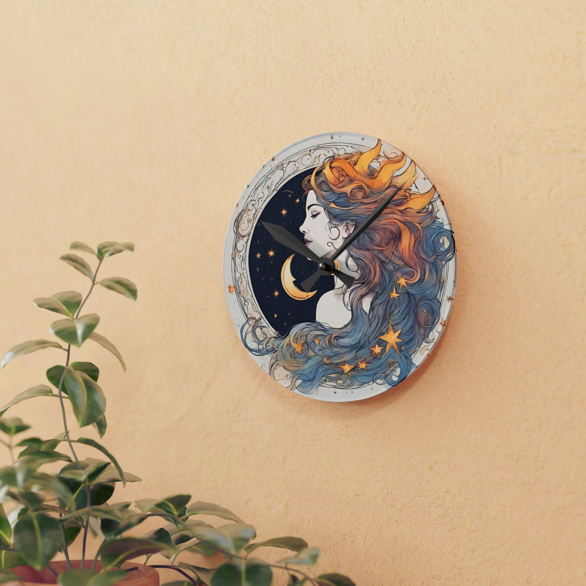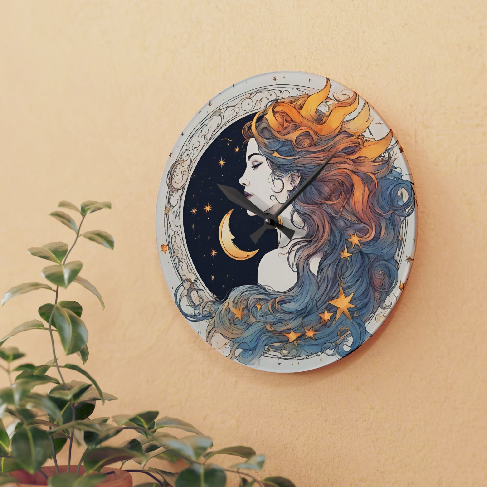 Moon Goddess Acrylic Art Clock | Lunar Stars & Space Astronomy Wall Hanging | Astrology Woman Home Office Solar System Wall Decor Gift