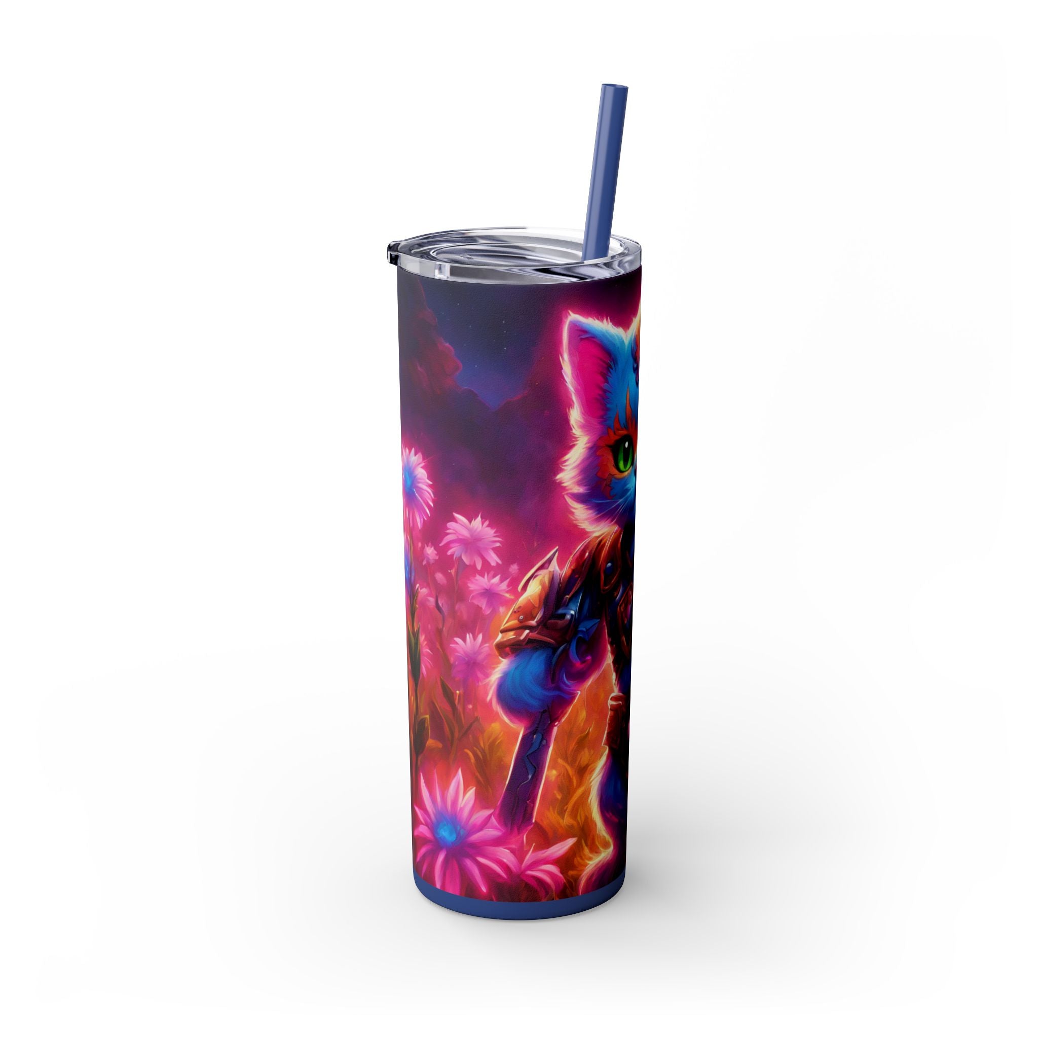 Ignite your warrior spirit with this Neon Warrior Cat Tumbler! Featuring a cosmic armor kitten surrounded by flame flowers in stunning neon style, this tumbler is perfect for cat lovers, warrior enthusiasts, and anyone who believes that kittens make the ultimate cosmic warriors.
