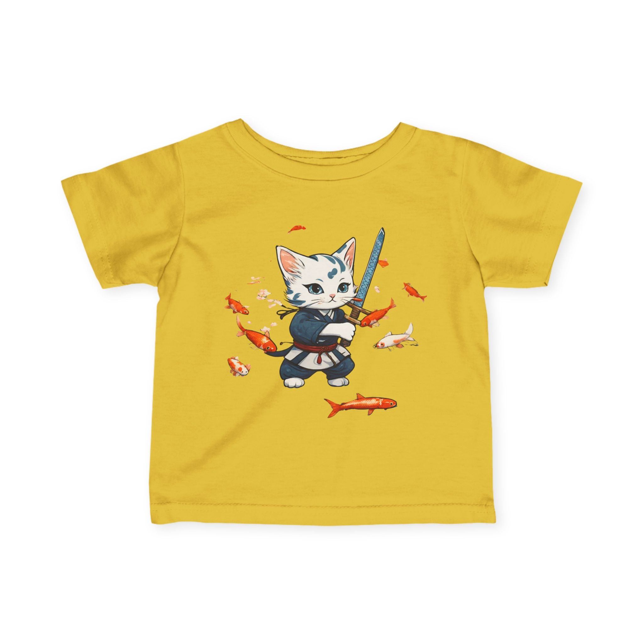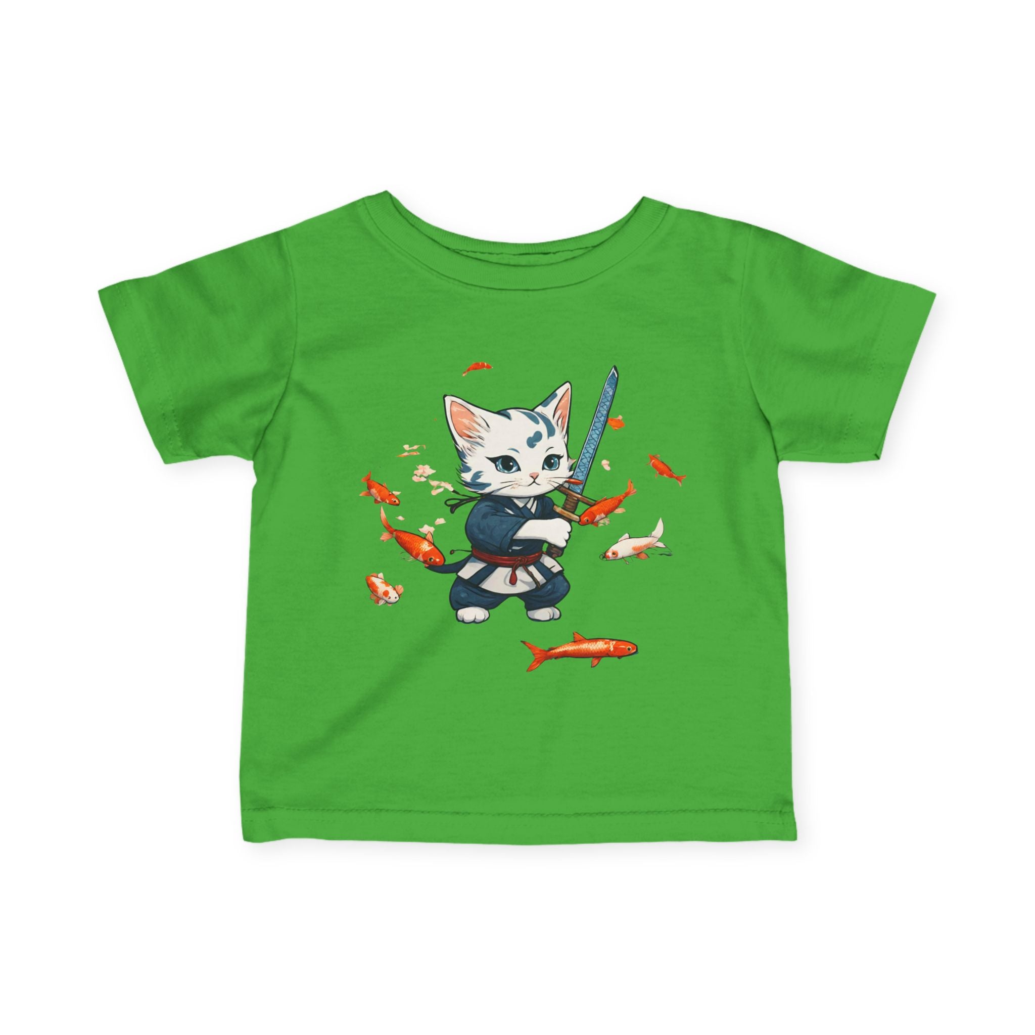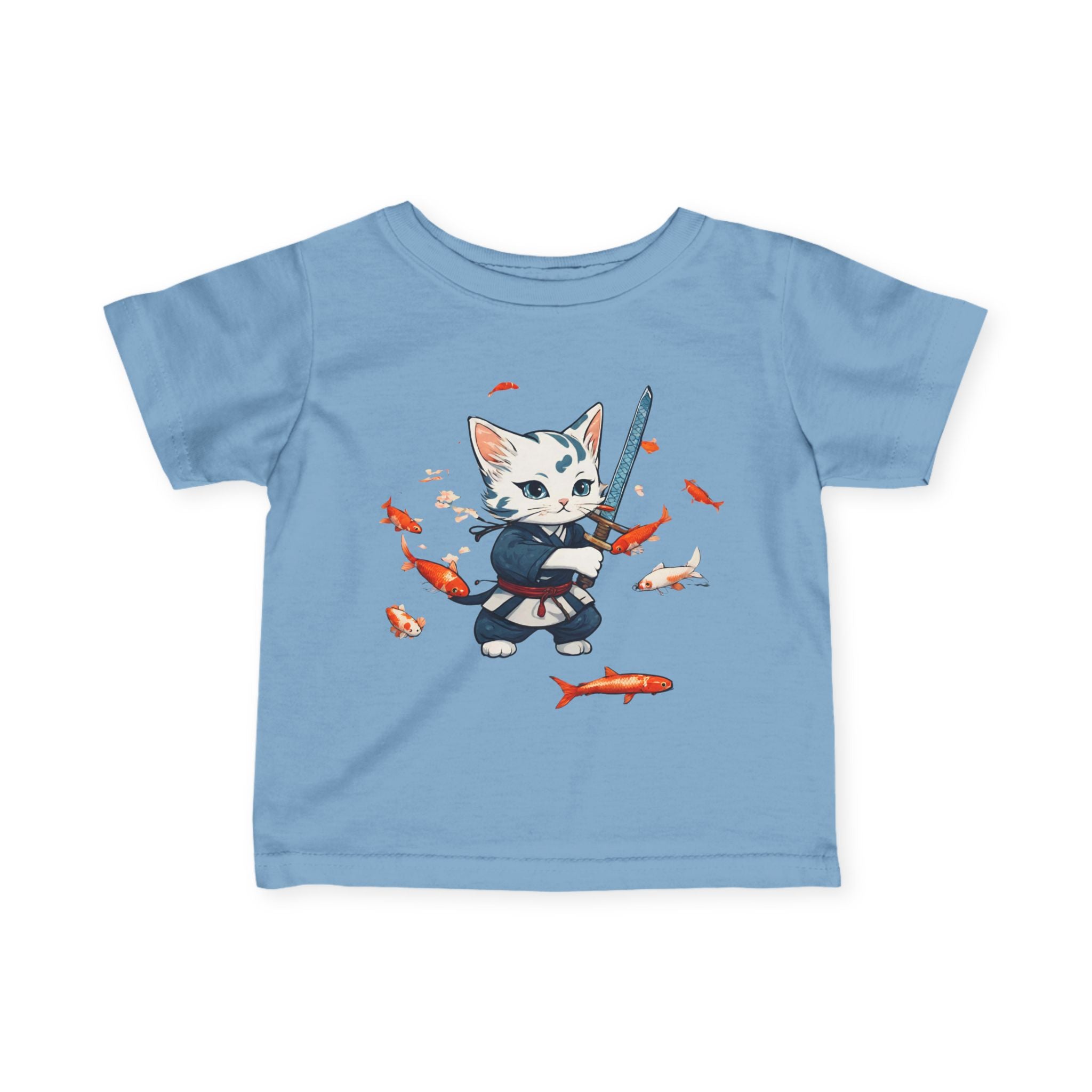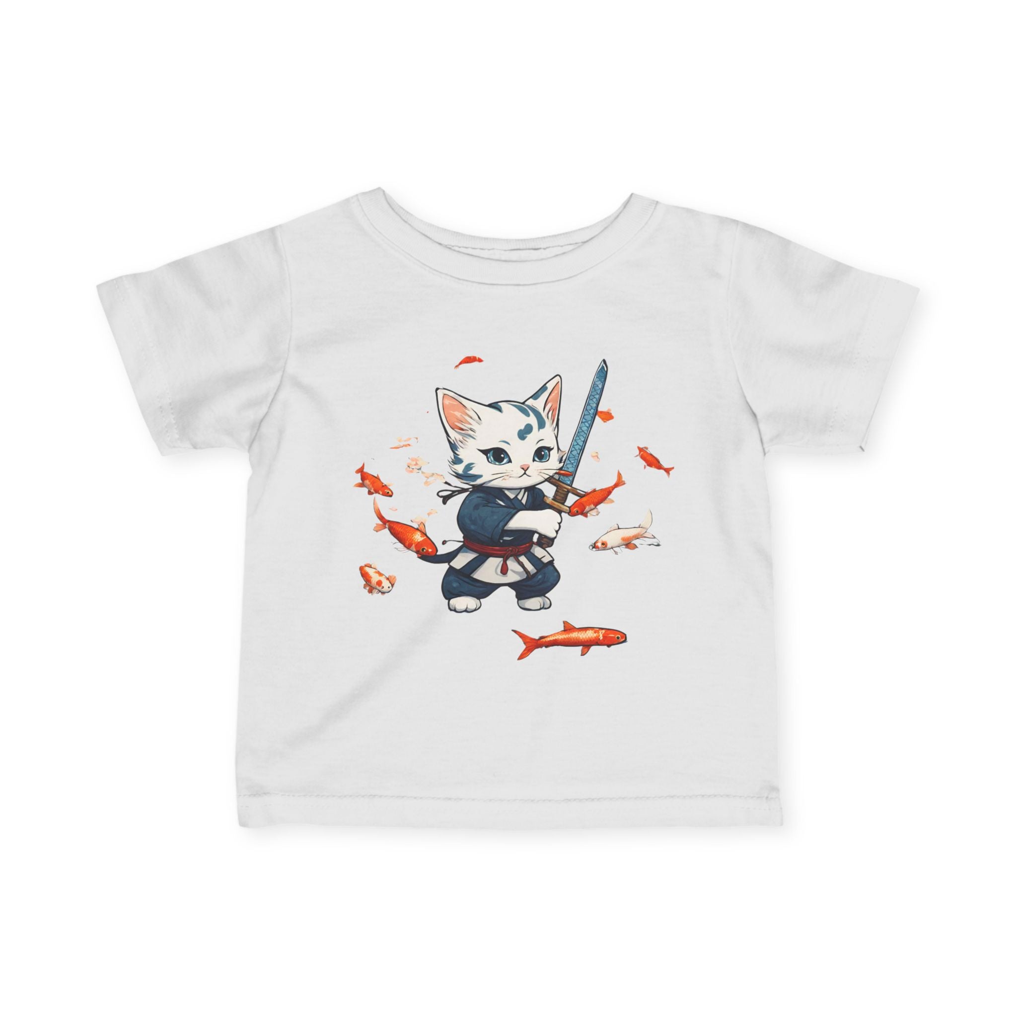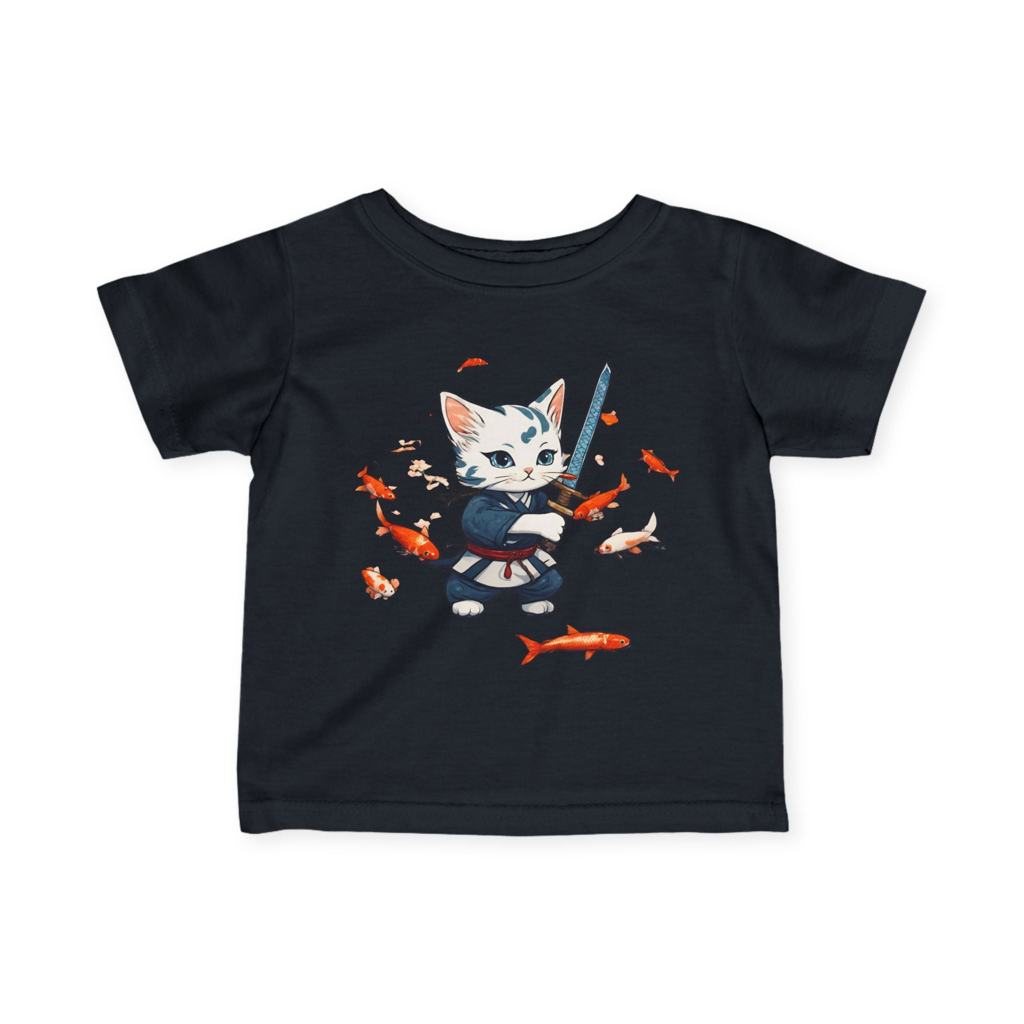 Introduce your little warrior to Japanese culture with this adorable Koi Samurai Kitten infant t-shirt! Featuring a cute kitten dressed as a samurai surrounded by koi fish, this tee combines kawaii cuteness with traditional Japanese imagery, perfect for babies and toddlers whose parents love anime, Japanese culture, or just adorable cat designs.